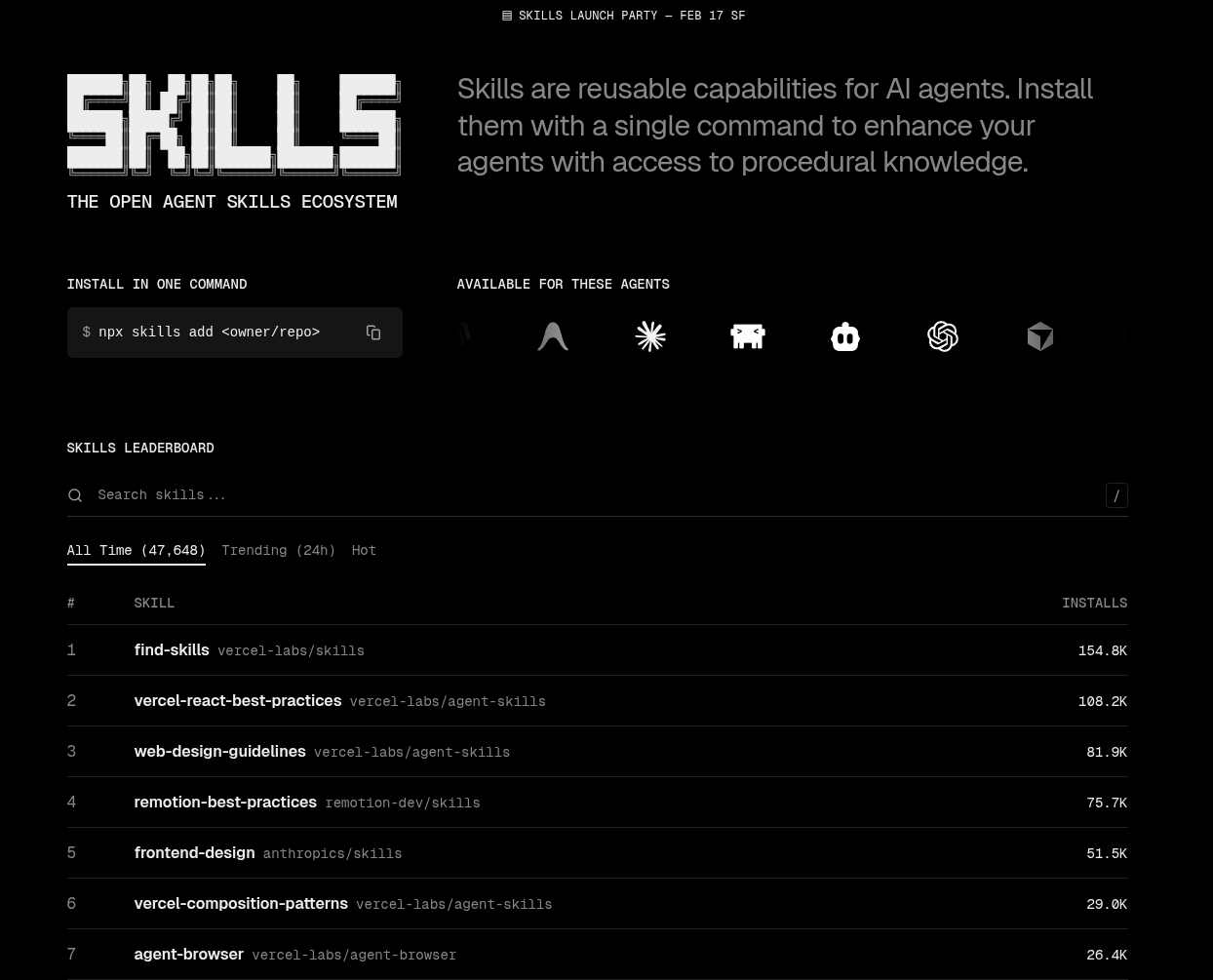 As the ecosystem matures, dedicated registries for agent skills (playbook-style prompts and specialized capabilities) are emerging. These focus specifically on discoverable, reusable skills rather than generic tools.
