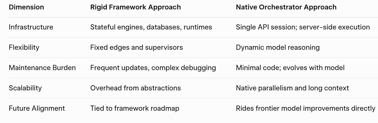 Both systems illustrate native orchestration: the frontier model plans, delegates to lightweight sub-sessions, aggregates results, and iterates—all within the model’s reasoning loop.