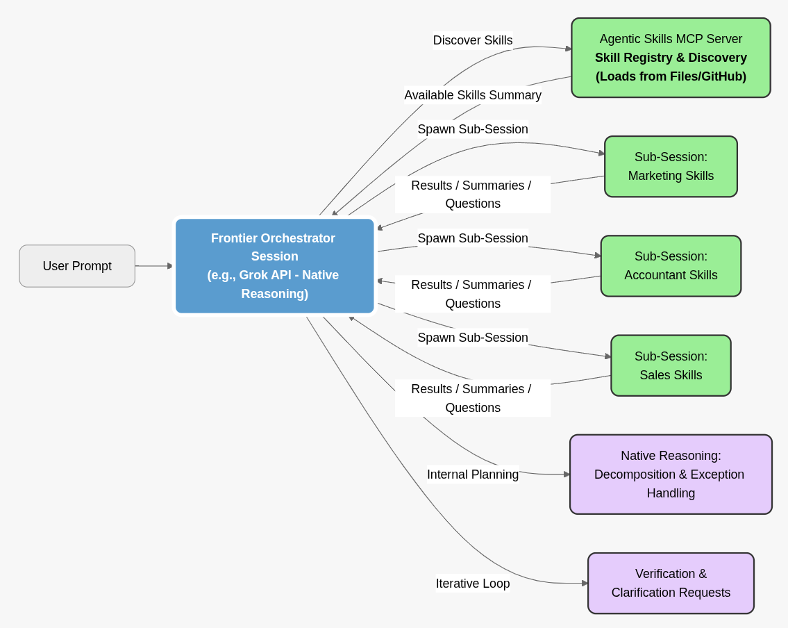 A single frontier session becomes the orchestrator: analyzing prompts, planning subtasks, invoking MCP-exposed skills in parallel, iterating, and resolving ambiguities—all server-side.